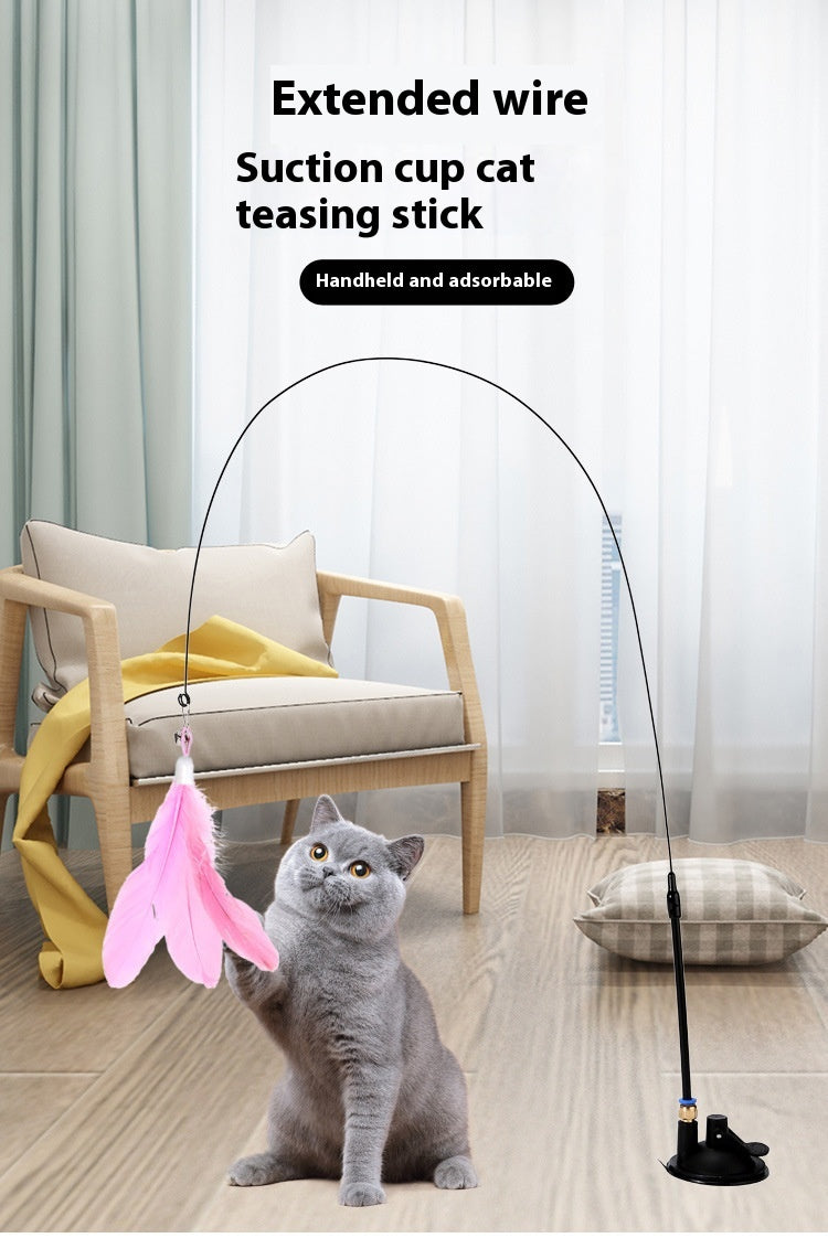 Keep your cat entertained for hours with this cat teaser wand with bell, featuring a fun feather attachment and suction cup holder for versatile play.